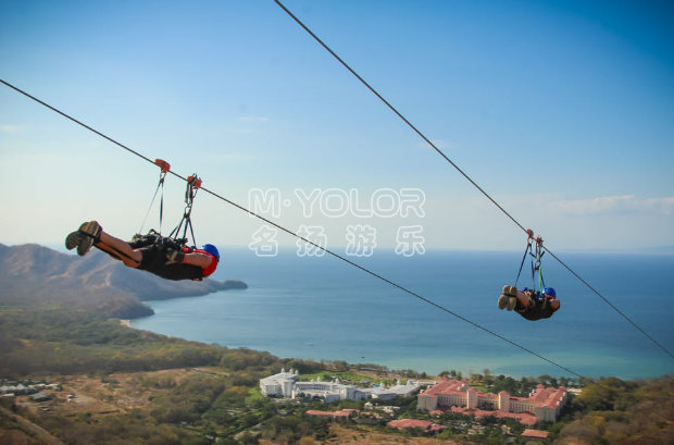 空中飛人,是一種新的滑系列項(xiàng)目升級(jí),它與滑索不同之處在于一般承載索是一根鋼絲繩,游客滑行姿勢(shì)是更自由的趴著向下滑行,伸開(kāi)雙手,體驗(yàn)像鳥(niǎo)兒一樣飛翔??罩酗w人采用自重力牽引技術(shù),游客通過(guò)自身所具有的勢(shì)能,巧妙地利用地勢(shì)的自然落差,在滑行過(guò)程中就像‘空中飛人’般,以高空的視角俯瞰山谷叢林水庫(kù)!感受地心引力引爆腎上腺激素!整個(gè)設(shè)施無(wú)任何其他動(dòng)力,低碳、環(huán)保、刺激,驚險(xiǎn)刺激又安全可靠。