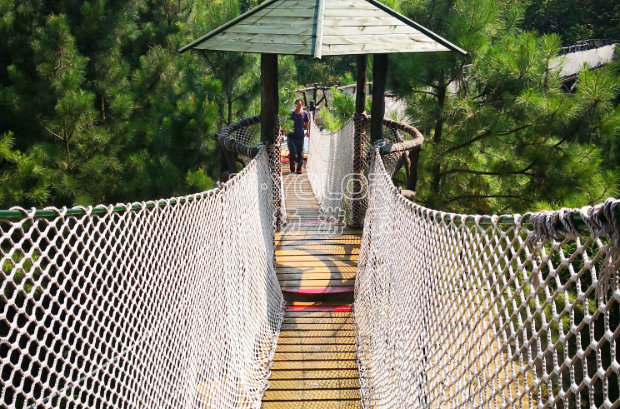 空中走廊是建在樹中間部分,走道是鏤空的,透過縫隙,可見下面的蕉林、汽車和人,都很小。兩棵樹之間的空中走廊長度起碼有幾十米,每一顆樹都有一個連接處,用麻繩、木板等固定。走上這猶如人間天橋的“空中走廊”,晃晃悠悠、凌空顫抖,正所謂欲進(jìn)不止,欲退不能。不過,常言道,登高望遠(yuǎn),走在這能看得到下面熱帶雨林的樹冠、身邊都是高低錯落密林的“天橋”,遠(yuǎn)處山巒起伏,南沙河穿林而過,真的猶如太空漫步、空中攬月,給人一種飄然欲仙,興奮至極、有驚無險的感受,驚、險、奇、特……讓你百感交集!