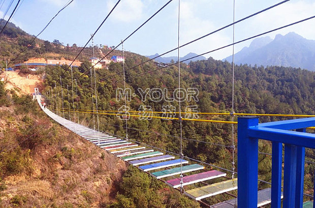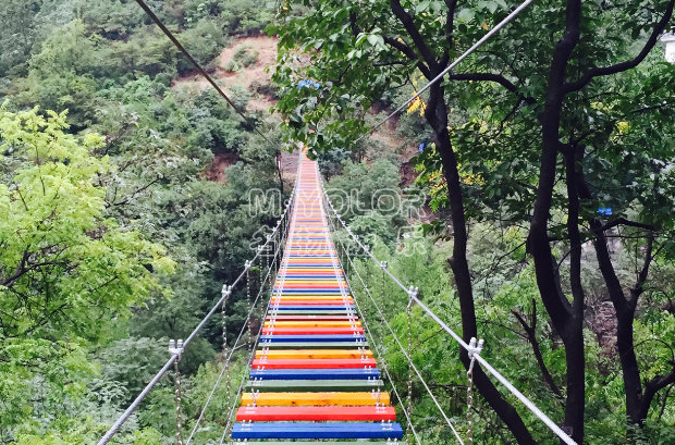步步驚心挑戰(zhàn)橋包括兩種:緬甸橋和鐵索橋;緬甸橋是通過承載索、保護(hù)索及手扶索組成的橋,可間隔鋪設(shè)木板或玻璃;鐵索橋是由鐵鏈和鋼絲繩組成的橋;在高空中行走,驚險(xiǎn)又刺激。建在懸崖外的鏤空平臺(tái),鏤空平臺(tái)之間的寬度從半步可以跨過去的寬度到一大步跨越的寬度,驚險(xiǎn)刺激程度也是逐步升級(jí)。每一步都是驚心動(dòng)魄的,每一步都是一個(gè)挑戰(zhàn),下面是萬丈深淵,走在上面的可謂是真正的“步步驚心”。
