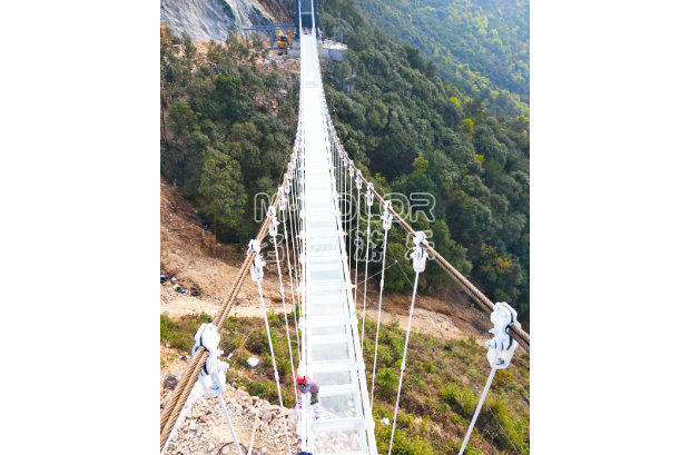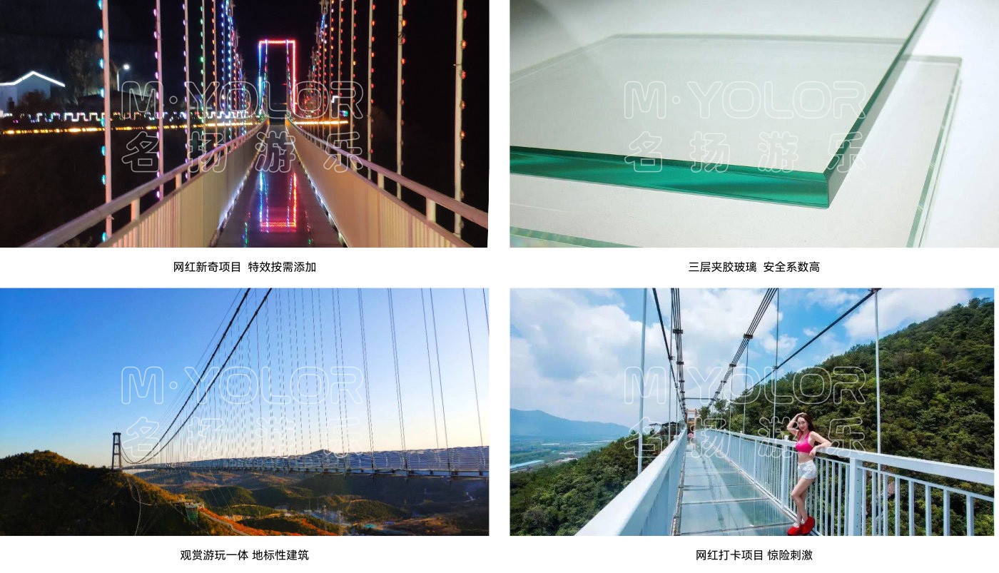 由鋼化玻璃凌空高架在懸崖峭壁上形成懸空透明的玻璃景觀橋,兼具通行、觀景、娛樂、T臺(tái)為一體,玻璃透光率高達(dá)99.15%。玻璃吊橋的險(xiǎn)與美得巧妙結(jié)合,打破傳統(tǒng)旅游觀景模式,全方位,各角度觀賞景色。平臺(tái)鋪設(shè)全透明玻璃,位于近百米高的懸崖峭壁之上,山河壯闊 人間煙火竟在眼前。