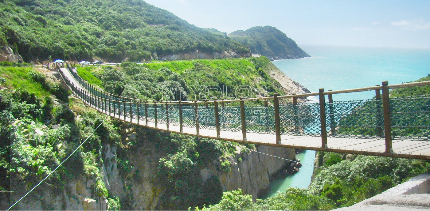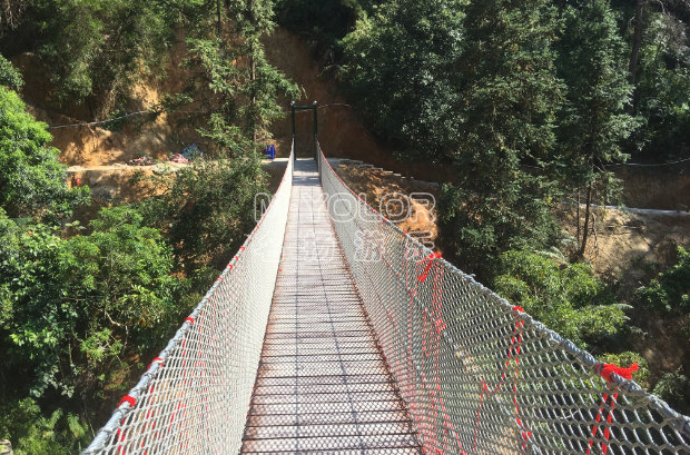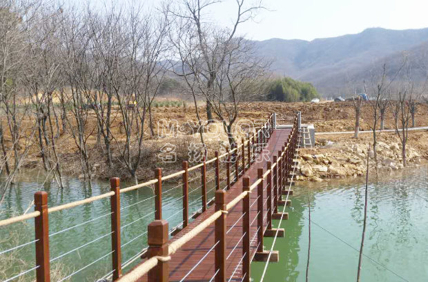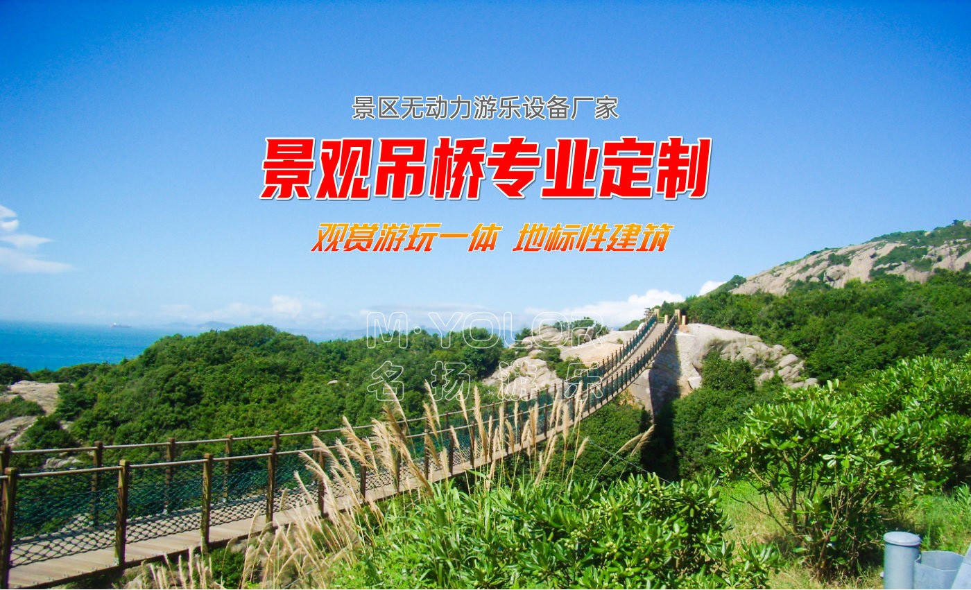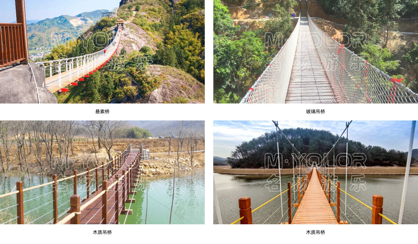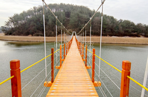 常用于過河或景區(qū)景觀設計,其承載索一般位于橋面底部,橋面兩邊扶手采用鋼絲繩或鐵索,橋面底部配有安全網(wǎng)。根據(jù)客戶間的要求,同時結(jié)合現(xiàn)場具體情況設計建造。此種吊橋的優(yōu)點在于外表美觀,橋面呈規(guī)則弧度,游客走在橋面上微微搖晃,給人的感覺舒服、自在。